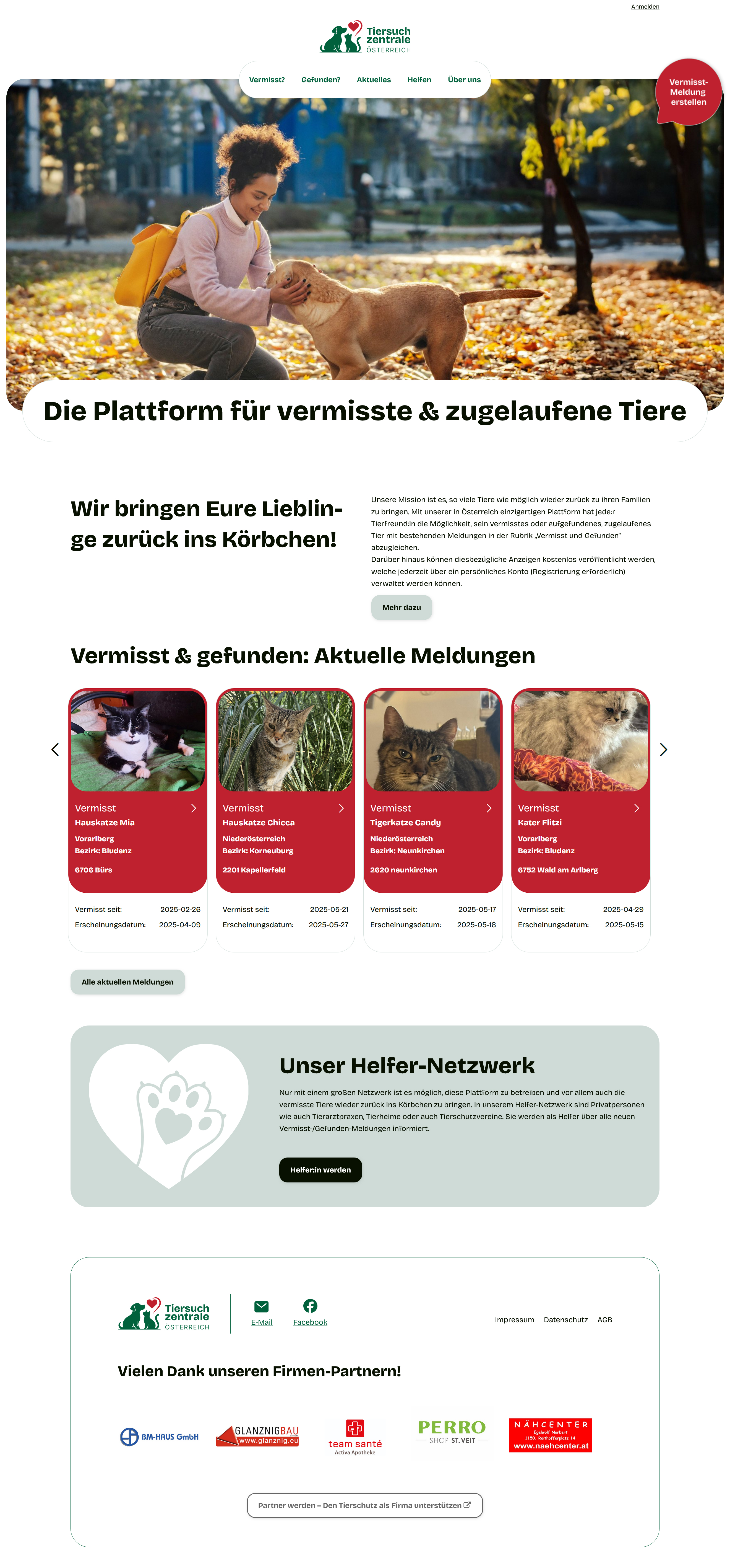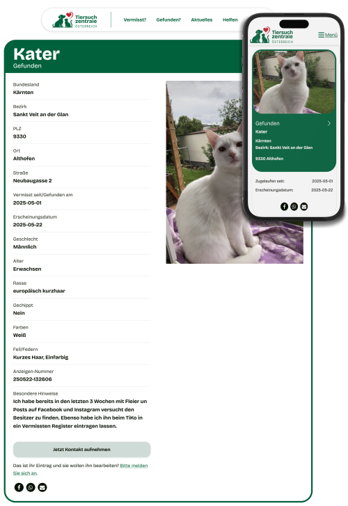 „Beim Design der Website stand im Vordergrund, allen Nutzerinnen und Nutzern einen schnellen und intuitiven Zugang zu Informationen über vermisste und gefundene Tiere zu ermöglichen. Die klare Struktur, einfache Navigation und ein übersichtliches Menü sorgen dafür, dass wichtigen Informationen auf einen Blick erkennbar und ohne Umwege erreichbar sind.“